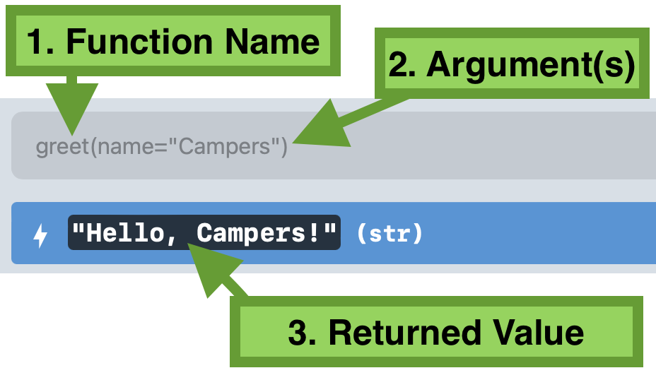 When you press enter, this function call expression is evaluated. Python will begin by looking at the identifier you gave, greet, and see if it knows what this name refers to. Well, in your module, you defined a function named greet. Python then sees, thanks to the parentheses following the identifier, that this is a function call so it checks to see “does greet refer to a function definition?” It does! So, Python will then take the argument value provided (in this case, name="Campers" says "name is assigned to be the str "Campers") and bind the str value "Campers" to the corresponding parameter in the function definition. Python then jumps into the function definition’s body and begins evaluating its code line-by-line. In this case, the only line of code is the return statement with the expression "Hello, " + name + "!". This statement evaluates the identifier name to be bound to the value "Campers", thus returning the concatenated value "Hello, Campers!".