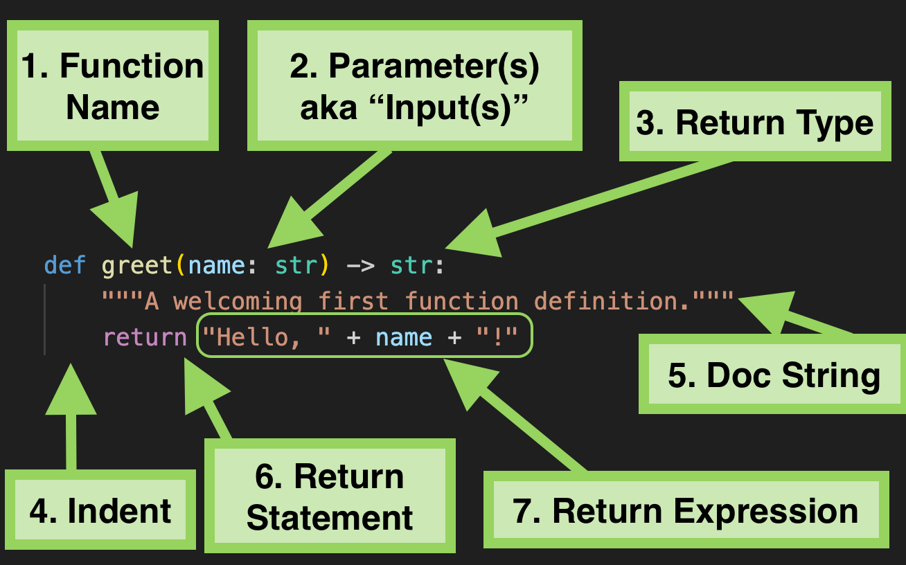 -followed by a greater than sign>which you think of together as an arrow->. What follows the arrow is the return type of the function. This is to say, when a function call expression to this function is evaluated, it will result in astrvalue. In other words, parts 1 through 3 together, say “I am defining a function namedgreetthat takes astrparameter namednameand returns astrvalue.” The return type is followed by a colon:which signals the “header” of the function definition is complete and what follows is the function definition’s body.Indentation is important in Python. Although invisible, the indentation signals that the following lines belong to the function definition. As soon as you stop indenting, you are no longer defining the body of the function.