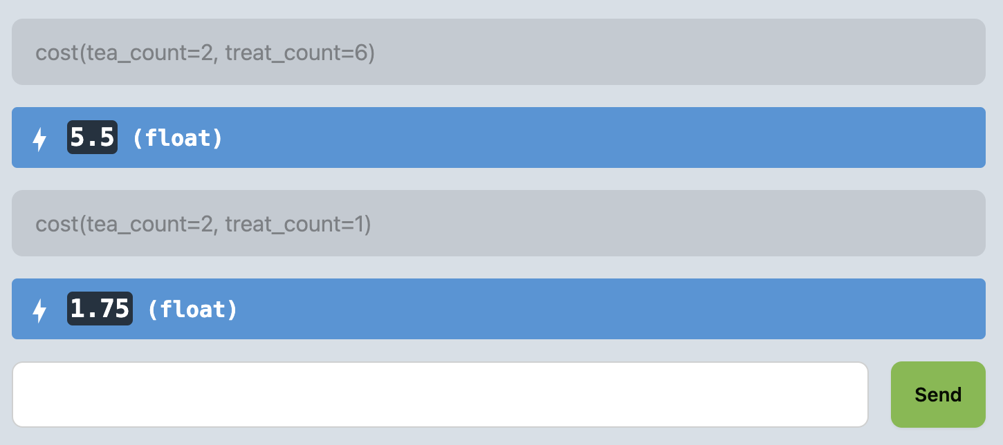 Now let’s implement a function to compute the cost of the tea bags and the treats combined. Add a couple blank lines following your treats function and then define a function with the following expectations: