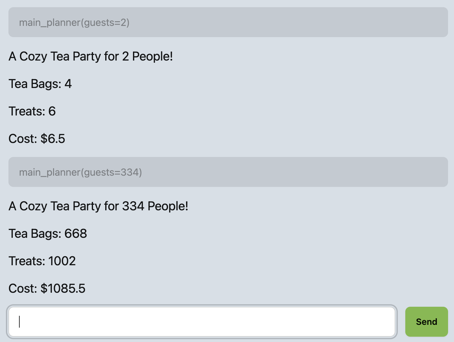main_planner REPL ExamplesYou should not be performing any arithmetic computations in main_planner, all of the arithmetic is handled in your functions tea_bags, treats, and cost. Your main_planner function must call the other function definitions you have written to perform these calculations.