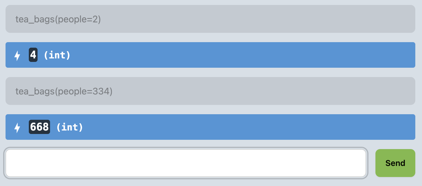 tea_bags REPL ExamplesTry a few additional function calls to be sure your function is working as you expect!