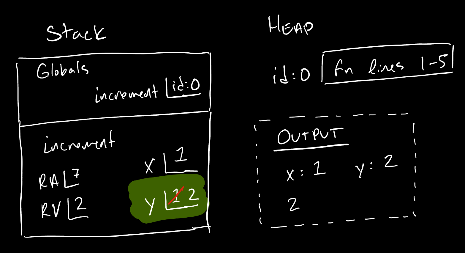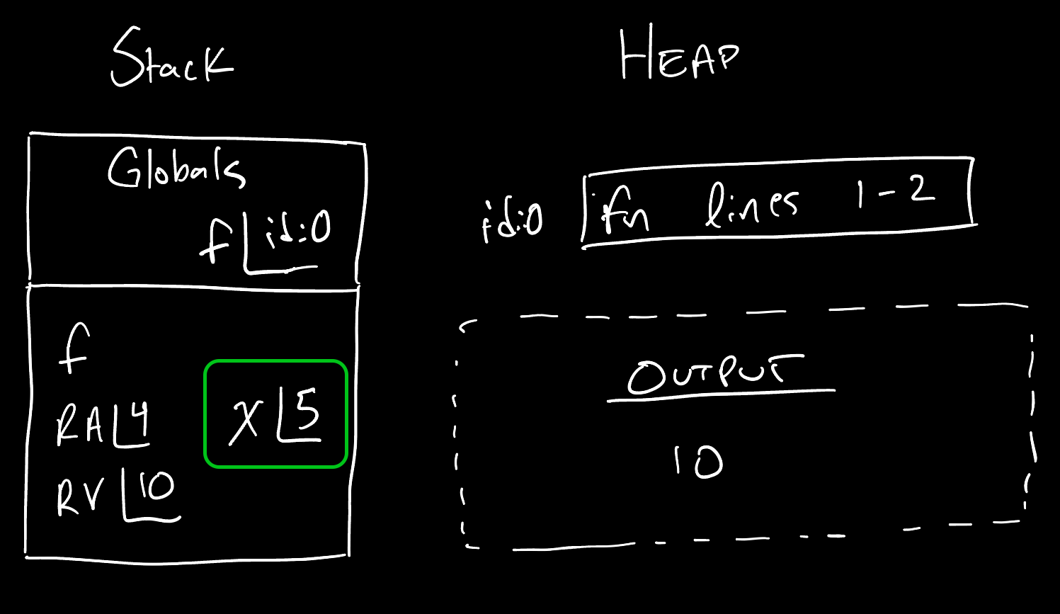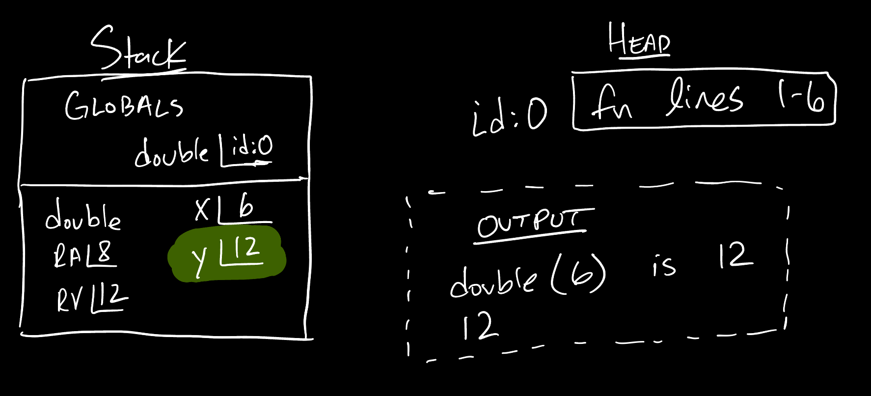 Let’s make this concrete with a quick example and corresponding memory diagram: