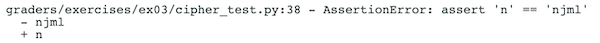 graders/exercises/ex02/cipher_test.py:38tells you which line of the grader found the missing functionality in your code. Since you cannot see the grader, you can ignore this part.AssertionError: assert 'n' == 'njml'tells you that your code outputted'n'but the autograder was expecting'njml'.- ` - njml, + n