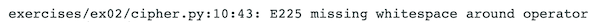exercises/ex02/cipher.pytells you that it was thecipher.pyfile that threw the error and that the file is located inexercises/ex02.10tells you that this error originated from line 10 of the given file.43tells you how far (how many characters) into the line the error occured.E225is a flake8 linter error. Linting helps identify formatting issues in your code. You can view these error codes here.missing whitespace around operatorgives you a brief summary of your formatting issue.